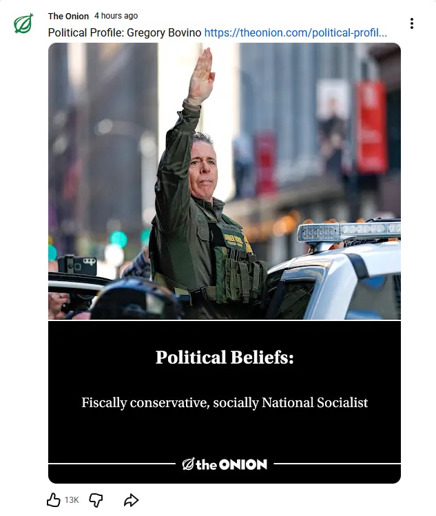 Yuritopiaposadism [none/use name]@hexbear.netEnglish · 2 days agoThe Onion fired their writers because reality just writes itself.hexbear.netimagemessage-square0linkfedilinkarrow-up11arrow-down10