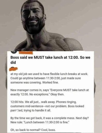 If the boss wanted everyone lunching at once, I assume that’s probably when they would take their own lunch, so they would have just closed the office for that hour.
