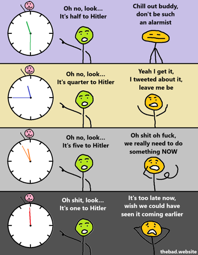[green, pointing to a clock with Hitler above it, that reads 11:59] Oh shit, look… It’s one to Hitler