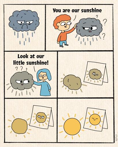 i think you’re reading too deeply. people tend to associate sunshine with happiness. i like the rain personally, but if we’re applying common imagery, there’s probably a message. pour enough love and happiness into something that is struggling to see love and happiness and it too may eventually start giving out love and happiness. i mean, it worked with my cat (she was a fiesty little semi-feral thing when we got her. i probably got two hours of playtime, half an hour of biscuits, and an hour of lap naps today. it took a lot of love to get her that trusting)