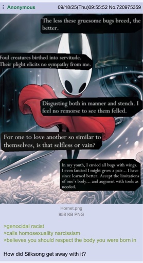 Her views on the flies in The Slab however, are somewhat problematic, but they are pretty gross and locked Hornet in a cell without just cause so she has right to be mad at them