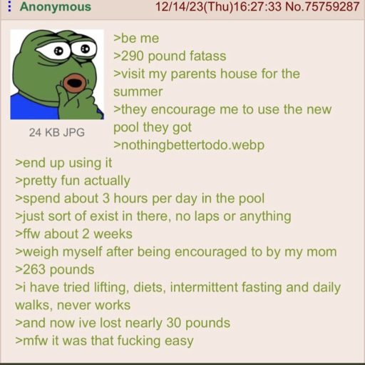 Swimming’s really good for losing weight, no sweating and less knee pain involved. Wish I had a private pool too, you can definitely tell the public ones are 30% filled with piss.