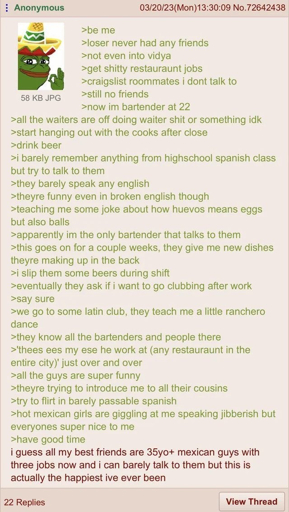arrow-up10arrow-down1imageAnon makes friends with the cookssh.itjust.works🍹Early to RISA 🧉@sh.itjust.worksM to Greentext@sh.itjust.works · 2 years agomessage-square2linkfedilink