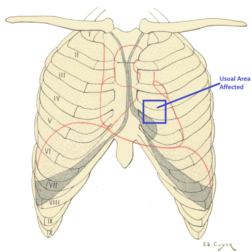 The pain is agitated by expansion and contraction of the chest. Taking a deep breath and allowing the rib cage to fully expand can relieve the pain, however it will feel unpleasant initially. At the point of full expansion, it can feel like a rubber band snap in the chest, after which the initial pain subsides.