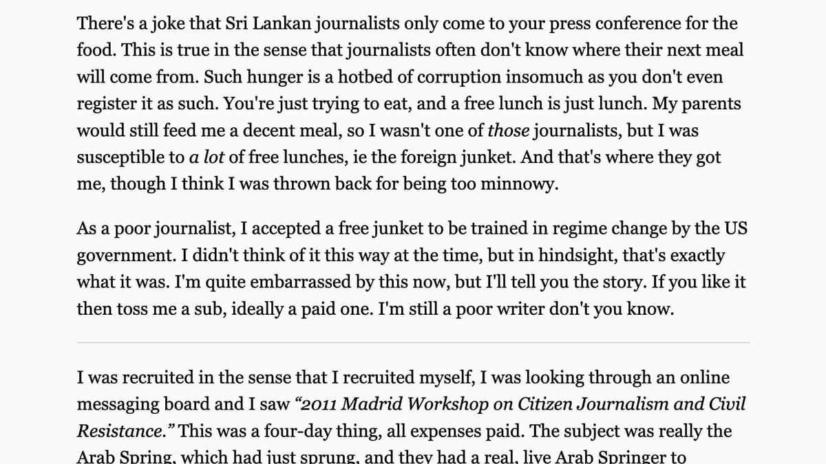 I didn’t even bother to look it up at the time (I was not a good journalist) but the President of the organization running it, Jack DuVall, was a former US Air Force officer with a deeply swampy resume. He was a Washington creature through and through, funded by a Wall Street insider trader, Peter Ackerman. It was real cabal shit, and I casually strolled into it, basically because I was bored and curious.