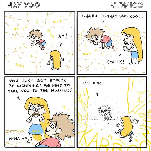 I thought this would be a continuation of the previous one, since this character fell off a cliff. Would have been funnier if she said “you just fell off a cliff” and then lightning strikes him