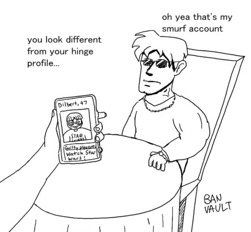 Smurfing on a dating app is a level of masochism I didn’t think is humanly possible. Those apps are already soul grinding enough.