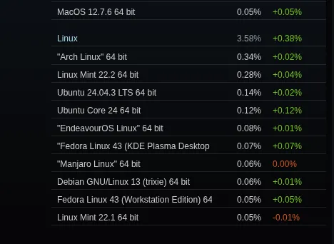 I would have thought the Linux share would be mostly made up of steam decks, but seems that’s not the case!