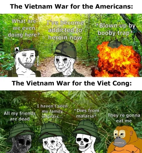 You’re misunderstanding the meme, Idk if willfully so since OP has already clarified it for you but that’s not what it is saying. Reading the ape as a viet cong is a reach and you should let this go.