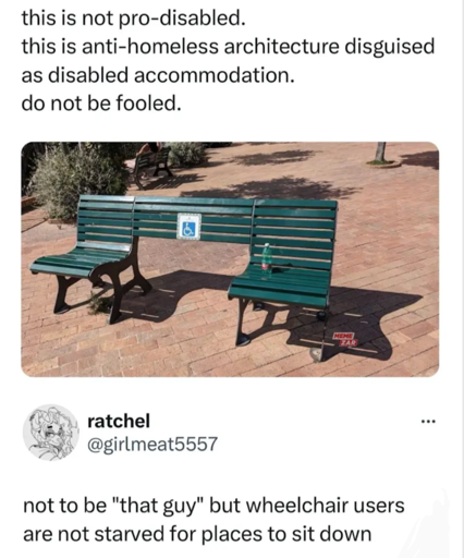 Imagine the money that went into consulting about these anti-homeless measures*, designing them*, going through the processes of manufacturing and installing them, and disposing of the perfectly usable and superior benches afterwards.
