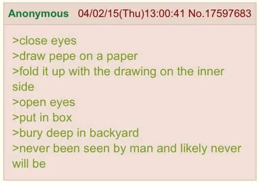 arrow-up183arrow-down1imageAnon creates the rarest pepesh.itjust.works🍹Early to RISA 🧉@sh.itjust.worksM to Greentext@sh.itjust.works · 4 days agomessage-square19linkfedilink