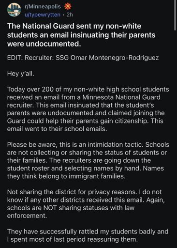 Enlisted recruiters don’t necessarily have the same leeway. They are directly graded on the number of enlistments they get in whatever reporting period. Their promotions often depend on it. They are also given materials and information to use. The message above looks like a mixture of someone trying to meet their enlistment quota through outreach and a certain well-intentioned blindness that comes from years of indoctrination to trust the system. I’d be hesitant to say this recruiter is personally trying to round up immigrants, although there is always a chance. It seems more likely that this either came from higher in the organization, like Pentagon level directive (arguably more concerning), or comes from short-sighted intention to help without considering or being aware of the broader dangers so they’re trying to disseminate info about programs that could have been helpful in the past without understanding how they can also be weaponized.