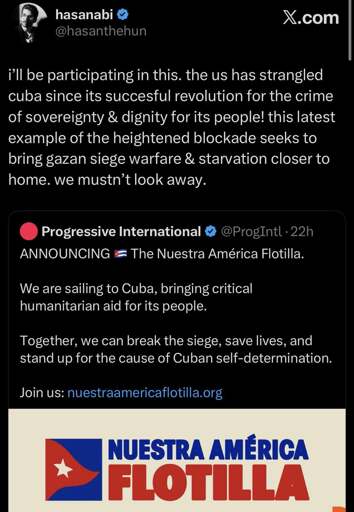arrow-up1135arrow-down1imageHasan joining Flotilla to bring aid to Cubalemmygrad.mlComradeCiruit ☭@lemmygrad.ml to The Deprogram@lemmygrad.ml · 13 days agomessage-square14linkfedilinkfile-text