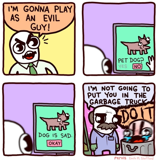 Too many games I’ve seen conflate being evil with being a jerk. Few games let you play the ‘long game’ where you are specifically nice and cooperative to deceive and manipulate. I think this partly due to decisions being made modular and point to point. Your overall morality then is calculated as some form of average of all the decisions you made. Mass effect series comes to mind.