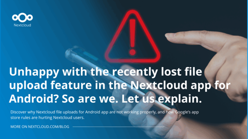 AngelikaMerkel@feddit.org to Technology@lemmy.worldEnglish · 9 months agoUnhappy with the recently lost file upload feature in the Nextcloud app for Android? So are we. Let us explain. - Nextcloudplus-squarenextcloud.comexternal-linkmessage-square24linkfedilinkarrow-up10arrow-down10