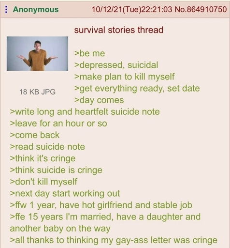 arrow-up11arrow-down1imageSuicide is cringe lemmy.mlLifeLemons@lemmy.ml to Greentext@sh.itjust.worksEnglish · 11 months agomessage-square0linkfedilink