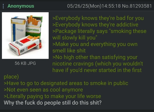 LifeLemons@lemmy.ml to Greentext@sh.itjust.worksEnglish · edit-210 months agoAnon discovers cigarettes (Edit: Anon discovers addiction)lemmy.mlimagemessage-square0linkfedilinkarrow-up11arrow-down10