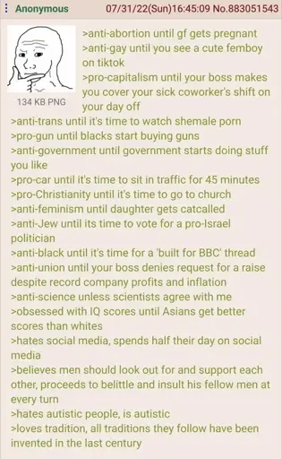arrow-up12arrow-down1imageanon describes conservativeslemy.lolnzmaa@lemy.lol to Greentext@sh.itjust.worksEnglish · 8 months agomessage-square2linkfedilink