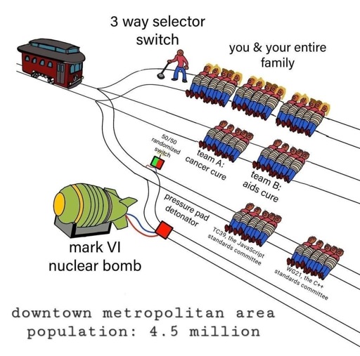 Sjmarf@sh.itjust.works to Programmer Humor@programming.dev · 1 year agoTrolley problem sh.itjust.worksimagemessage-square5linkfedilinkarrow-up10arrow-down10